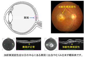 加齢により網膜の中心部である黄斑に障害が生じます。年齢を重ねると網膜に老廃物が蓄積します。これは加齢黄斑変性症の重要な要因です。社会の高齢化と食生活の欧米化により加齢黄斑変性症が増加しています。喫煙もひとつの要因になります。禁煙や特殊なサプリメント、または緑黄色野菜の摂取は加齢黄斑変性症の発症を抑えられます。